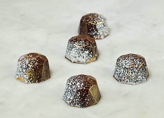 Füllung: Kuvertüre mit mind. 65% Kakao (Kakaomasse, Rohrzucker, Kakaobutter), Kakaofruchtsaft, Pralinè Masse (Mandel, Zucker Kakaobutter), Kokosbutter, Olivenöl, Mandeln, Glukose, Sorbitol, Zucker, Timutpfeffer, Salz, kolorierte Kakaobutter